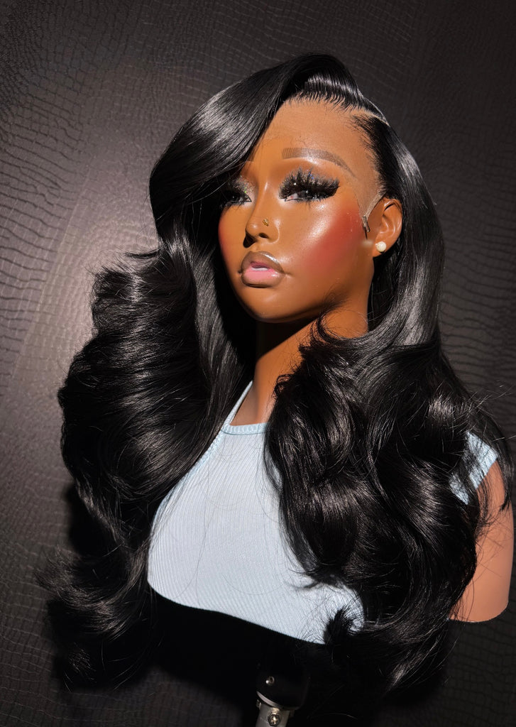 5x5 closure with 4 bundles of 22 inch 613 colored jet black cut and layered with loose curls.