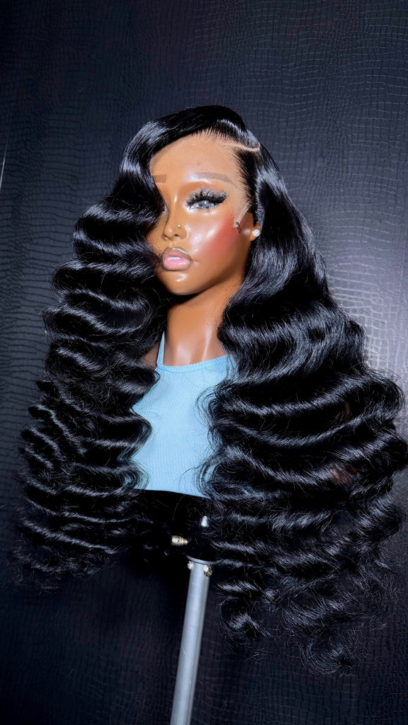 Next4 bundles of 28 inch deep wave bundles paired with 20 inch 5x5 had lace closure colored jet black head size 22